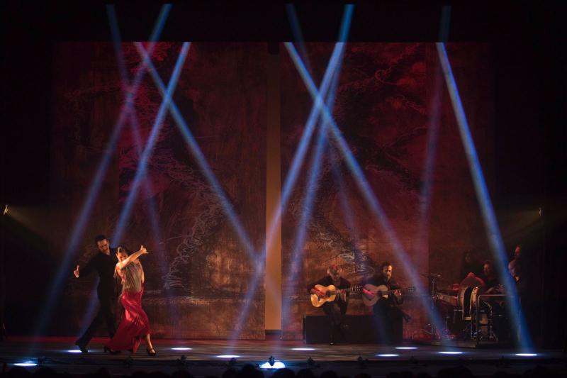 El espectáculo iba transcurriendo con siluetas proyectadas sobre el fondo, a veces más grandes, a veces más pequeñas, a veces superpuestas y otras solitarias, el desgarro de los cantes de Rubio de Pruna e Israel Fernández, y los bailes del resto de la compañía, además de los del coreógrafo José Serrano, llenos de fiesta y sudor, de alegría y flamenco, de percusión en las manos y los golpes de Antonio Suárez y el ‘Pájaro’, mientras Sara Baras cambiaba de vestido para ajustarse a la siguiente coreografía.
