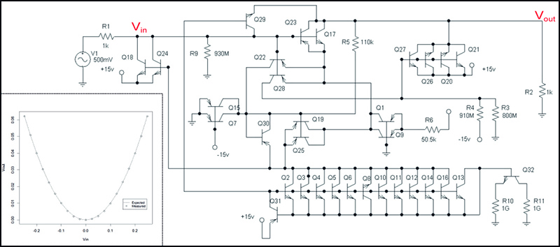 Castejón plantean un ejemplo concreto: “imaginemos que se quiere diseñar un circuito que reproduzca la función potencia al cuadrado, de tal forma que, al resultado de aplicar un valor de tensión V a su entrada, se produzca un valor de tensión V2 a su salida”. Hasta el momento, el diseño de circuitos analógicos, tal y como señala Carmona, “se considera más un arte que una ciencia, en el que el conocimiento, la experiencia y la creatividad del diseñador juegan un papel crucial. Basta pensar no sólo en la enorme cantidad de posibilidades de conectar un determinado número de componentes para formar un circuito, tanto mayor cuanto mayor sea el número de componentes, sino también en el enorme número de combinaciones de valores de cada uno de ellos para cada opción de conexionado”.