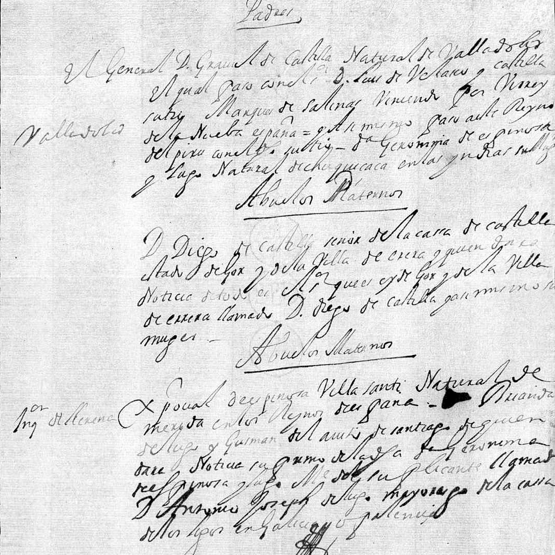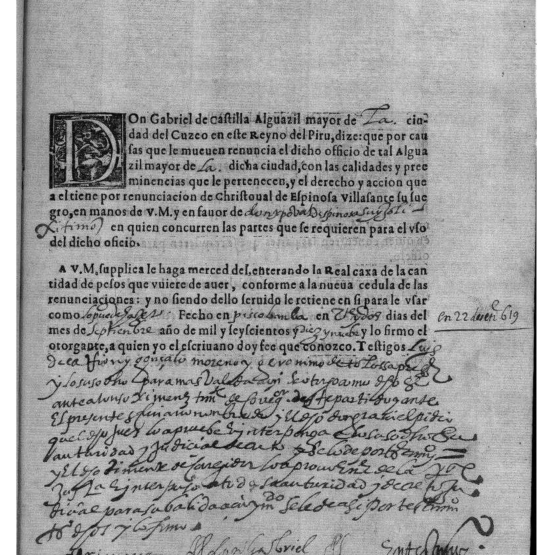 «Y dejo y nombro por mis herederos en el remanente de mis bienes a doña Jerónima de Espinosa, mi legítima mujer, y a mis hijos don Gabriel de Castilla y a don Cristóbal de Espinosa, en quien hice renunciación de la vara de alguacil mayor de la ciudad del Cuzco, y a doña Antonia de Guzmán y Lugo y a doña María de Castilla y a doña María de Espinosa y a doña Ana de Espinosa, mis hijos legítimos y de la dicha doña Jerónima de Espinosa, mi legítima mujer”.