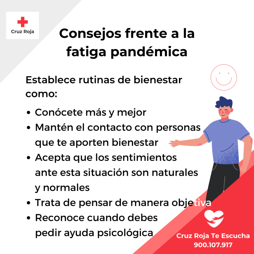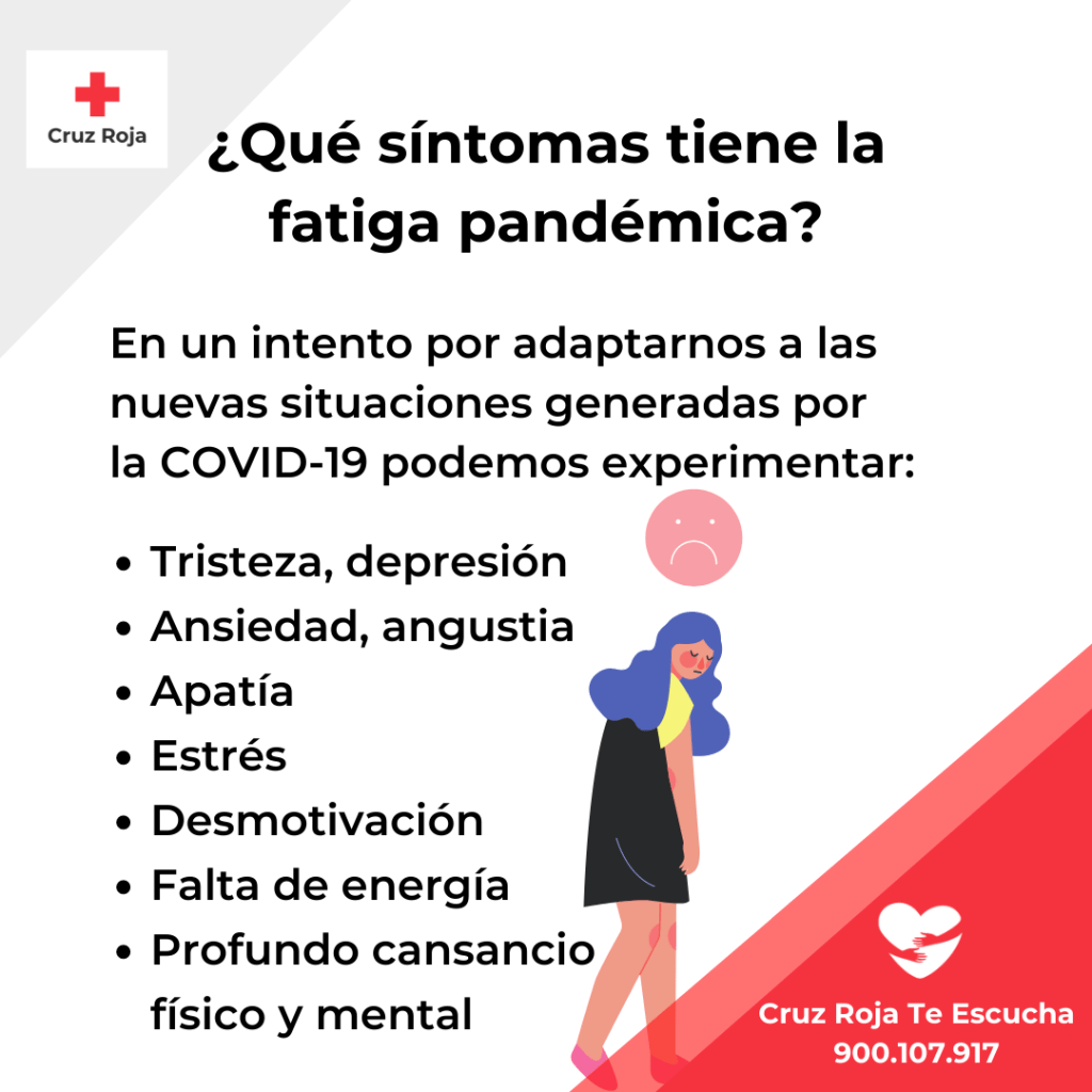 Se trata de una fatiga real, generada por el constante estado de alerta en que vivimos, que produce una desmotivación para asumir las conductas de protección recomendadas. Las medidas necesarias generadas para el cuidado de la salud de las personas, como el uso de mascarillas, el lavado de manos, la distancia de seguridad…, terminan generando un agotamiento caracterizado principalmente por tristeza y depresión, ansiedad y angustia, apatía, estrés, desmotivación, profundo cansancio físico y mental o falta de energía.