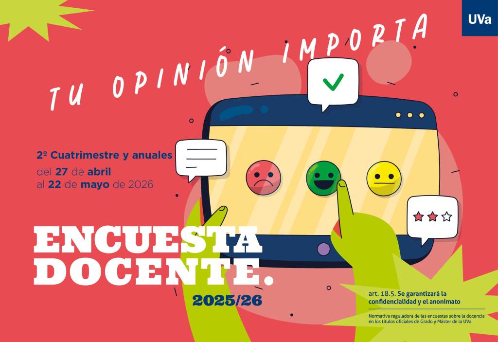 La Universidad de Valladolid ha activado el proceso de evaluación docente correspondiente al segundo cuatrimestre del curso, que permitirá a los estudiantes valorar sus asignaturas y al profesorado entre el 27 de abril y el 22 de mayo. El procedimiento se realiza de forma telemática, anónima y confidencial a través de la plataforma habilitada en la web institucional.